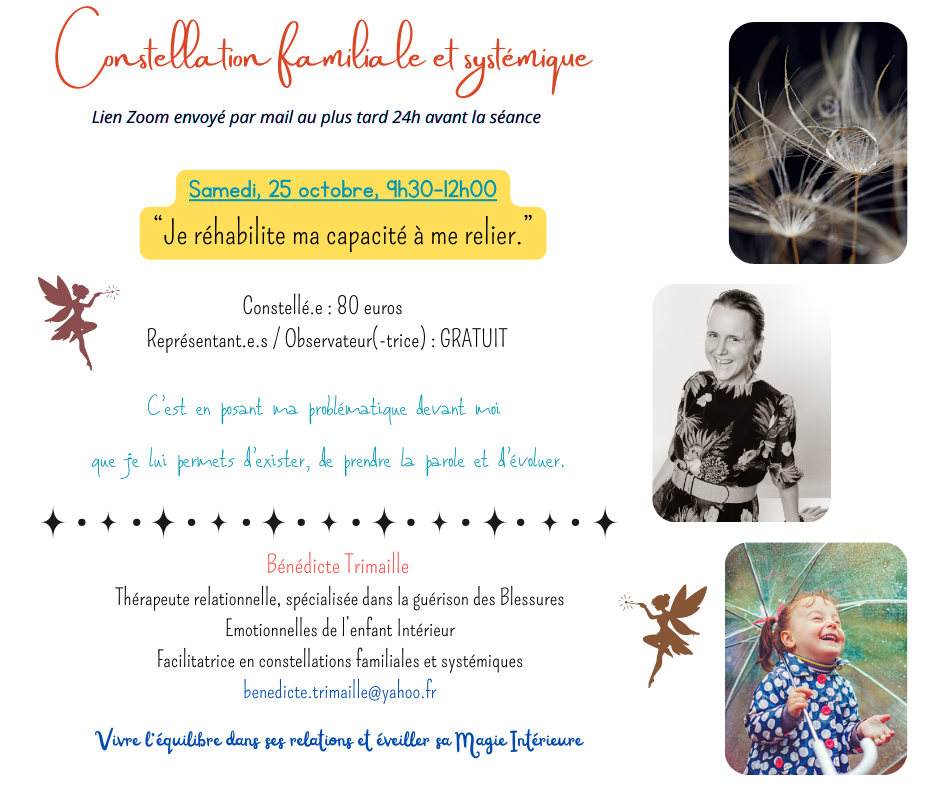 Vous allez expérimenter : prise de conscience profonde, libération respectueuse des poids hérités et ouverture vers une place plus juste et choisie dans votre vie et vos relations.