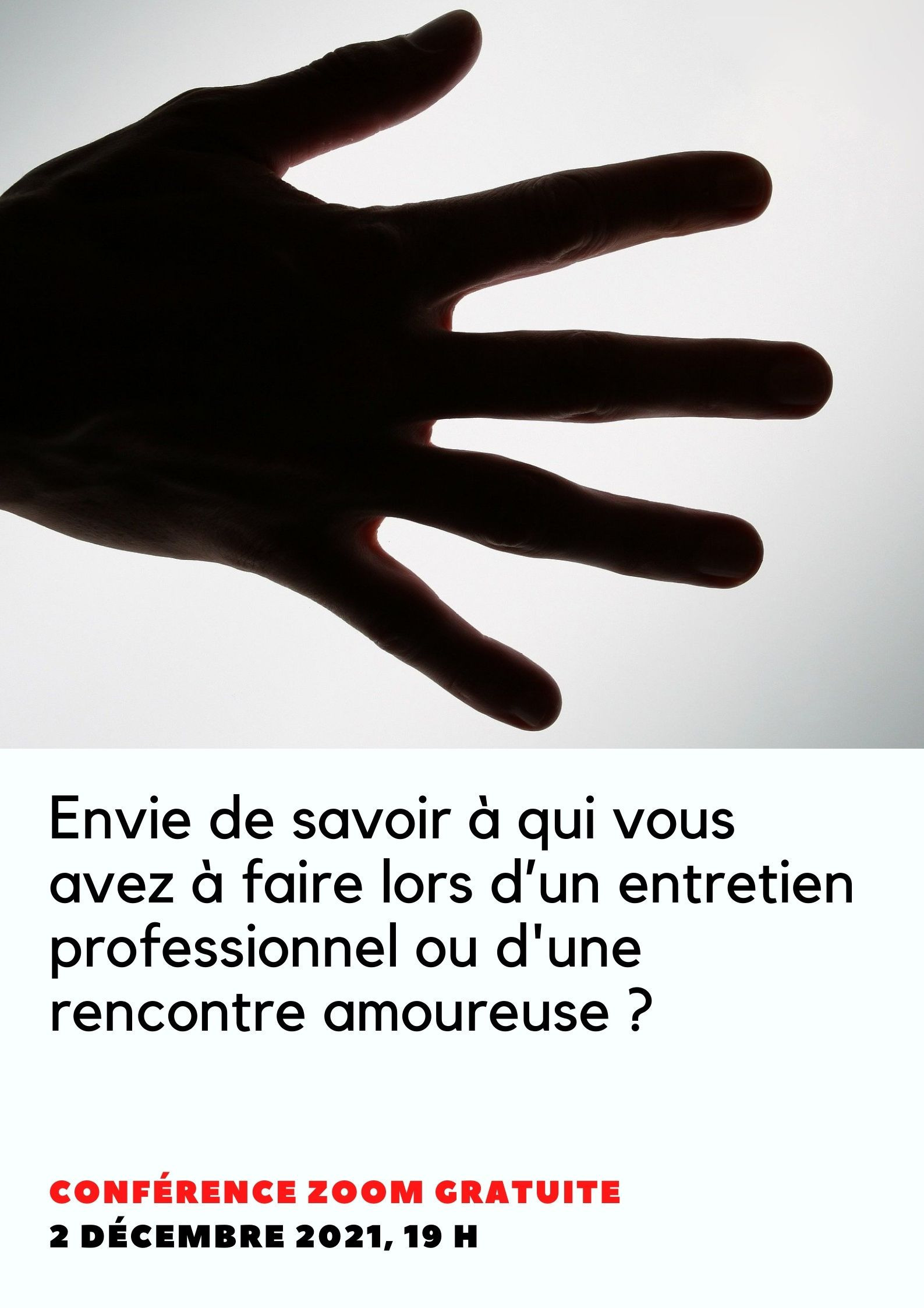 Venez découvrir le monde fascinant de la chirologie. Les thèmes abordés incluent l'histoire de la chirologie, le décodage de la gestuelle et des poignées de main, comment séduire et gérer sa vie sentimentale, le diagnostic de son tempérament pour réussir sa vie professionnelle, etc. Ces sujets seront traités lors de conférences et d'ateliers.