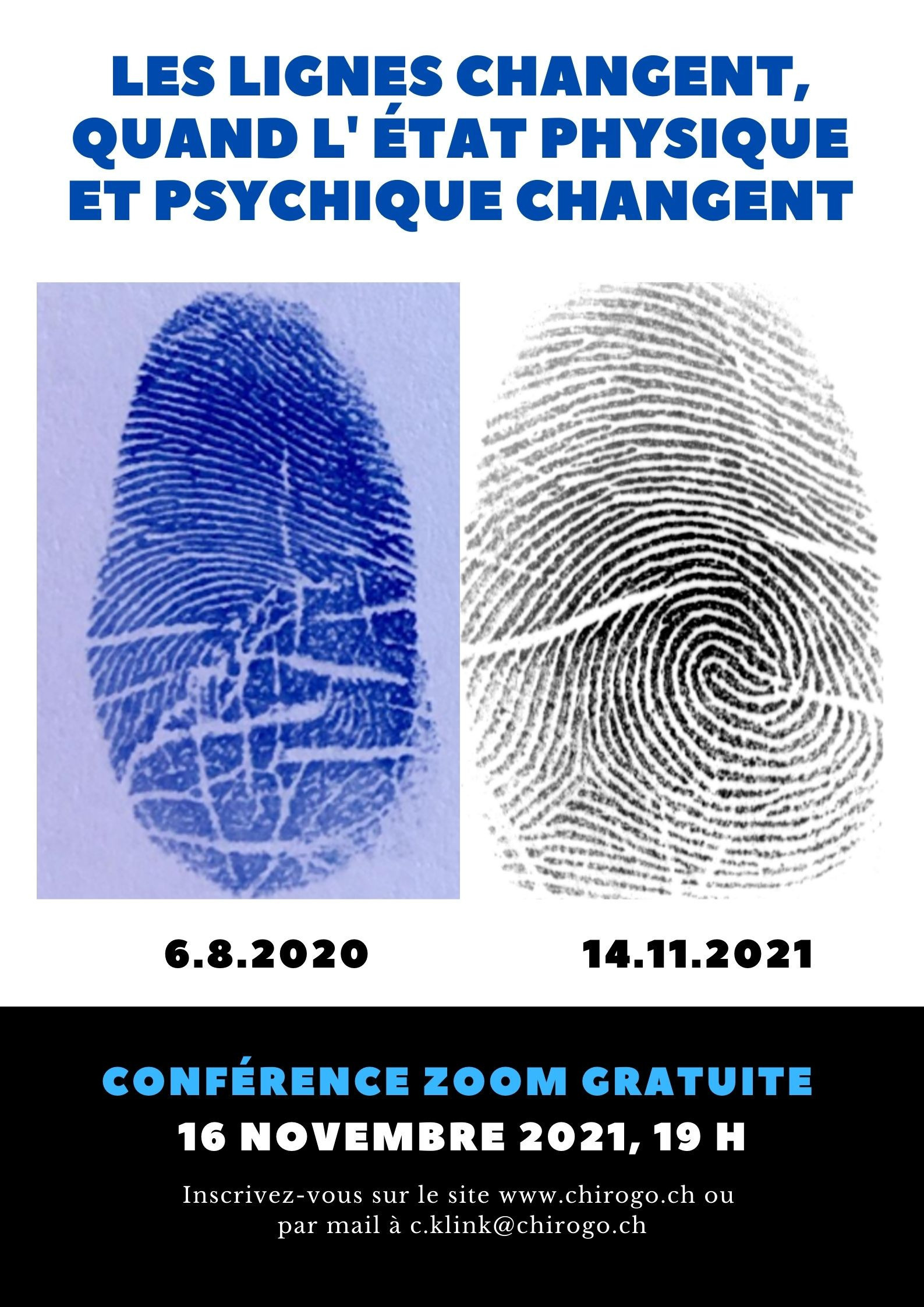 Pour les séances en ligne, un kit pour prendre vos empreintes est envoyé par la Poste et coûte CHF 10.-. Les séances en ligne doivent être payées à l'avance via Twint, PayPal ou virement bancaire.