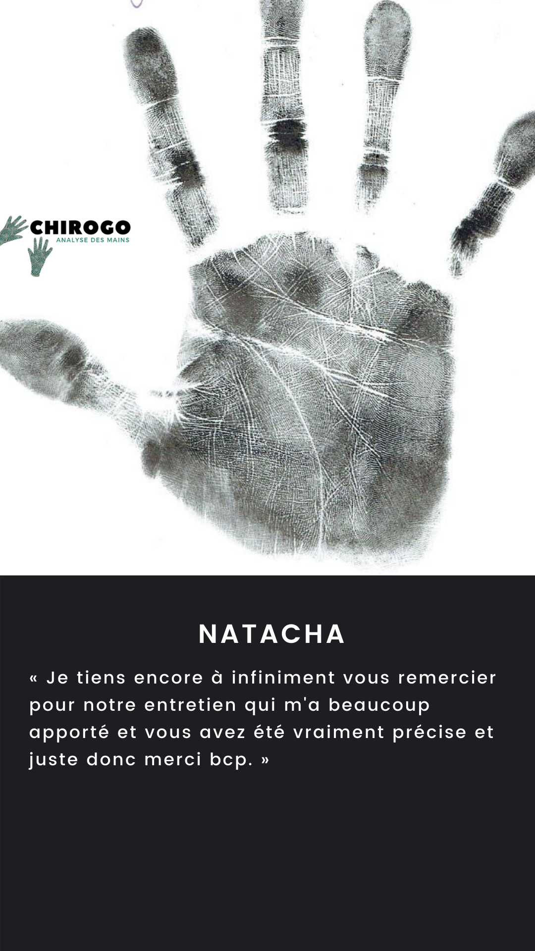 Profitez d'une consultation privée en présentiel ou en ligne pour découvrir votre personnalité, votre tempérament et obtenir toutes les clés pour réussir votre vie. Grâce à l'observation de la forme de votre paume, de vos doigts, de vos ongles et des lignes de votre main, vous bénéficierez d'un bilan personnel approfondi.