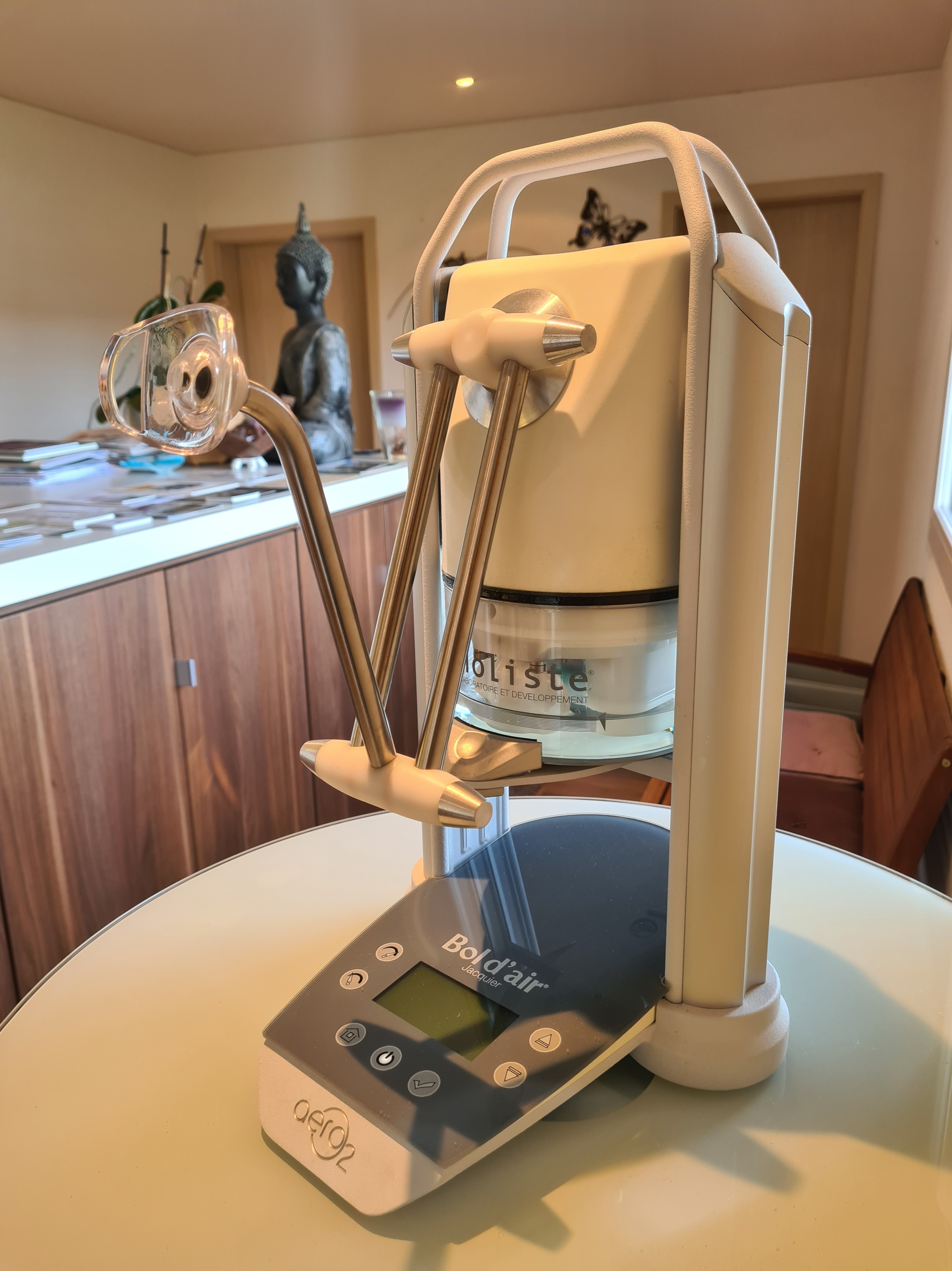 Le Bol d'air® est un dispositif élaboré qui permet de transformer les parties volatiles d'un extrait de résine de pin en porteurs d'oxygène, pour faciliter son assimilation dans l'organisme. Il favorise tout le métabolisme cellulaire grâce à son action sur les processus de détoxification et de production d'énergie.